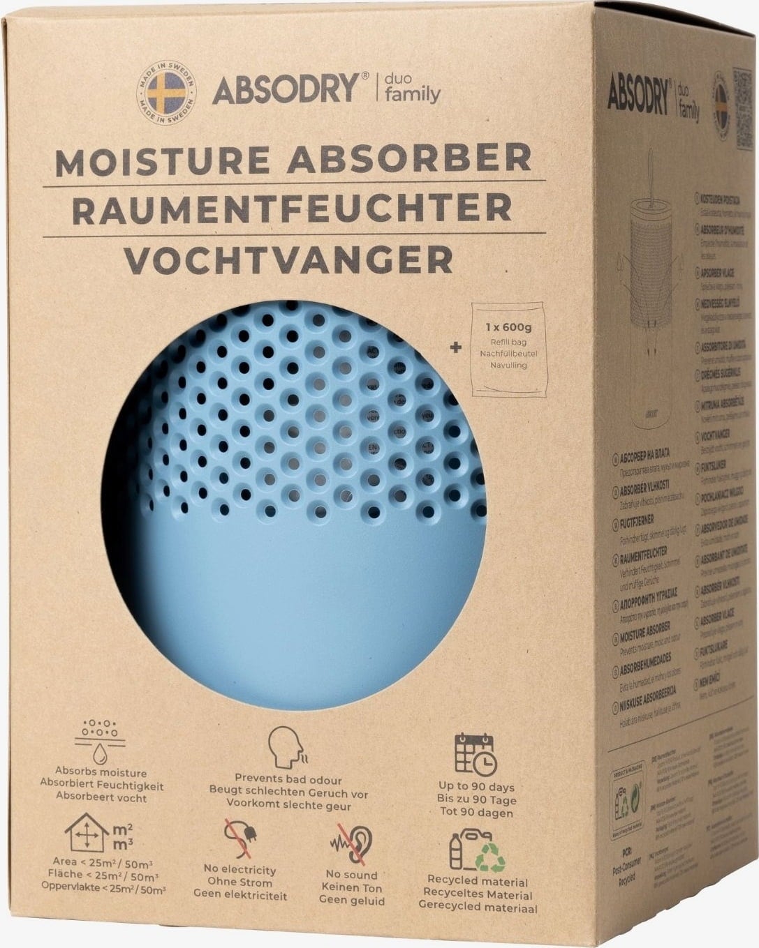 Leveransomfattning: Avfuktare inkl. 600 g refillpåse med fuktabsorberande kristaller