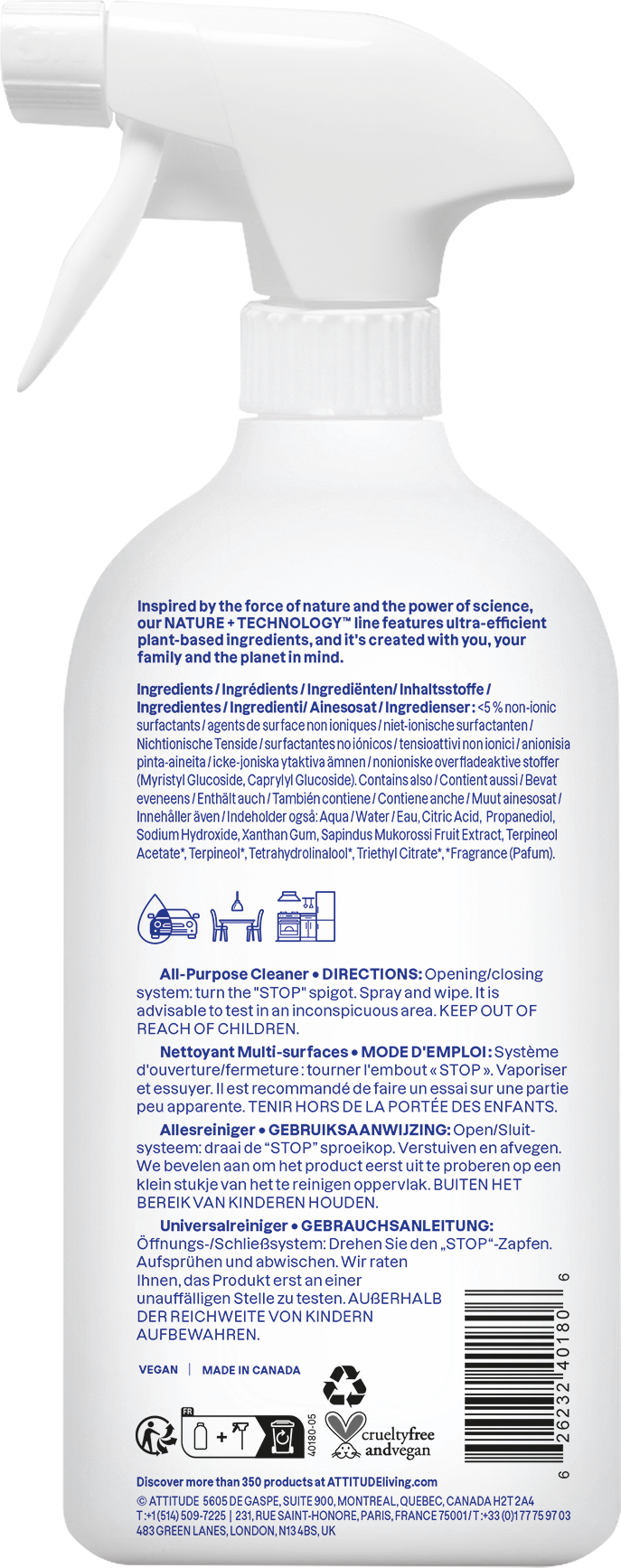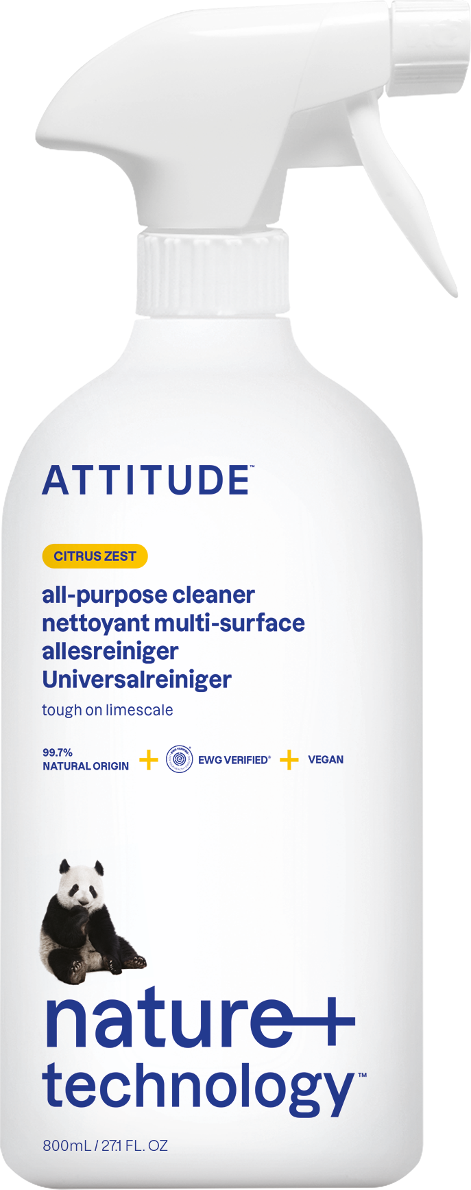 Universalrengöringsmedlet från ATTITUDE använder naturliga ingredienser för att rengöra ytor i hela hemmet.