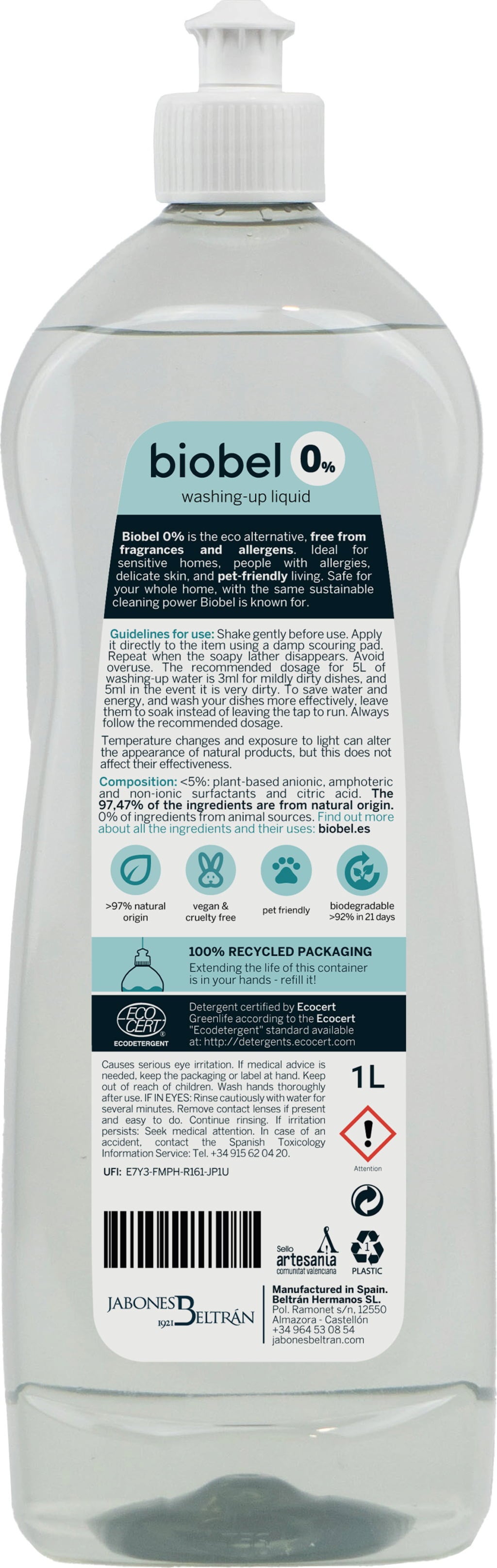 Detta diskmedel innehåller 100% ingredienser av naturligt ursprung, inklusive vegetabiliskt glycerin, och avlägsnar smuts, matrester och fett från alla typer av disk. Formulan är särskilt mild, så även om du är känslig behöver du inte oroa dig för din hud när du diskar.