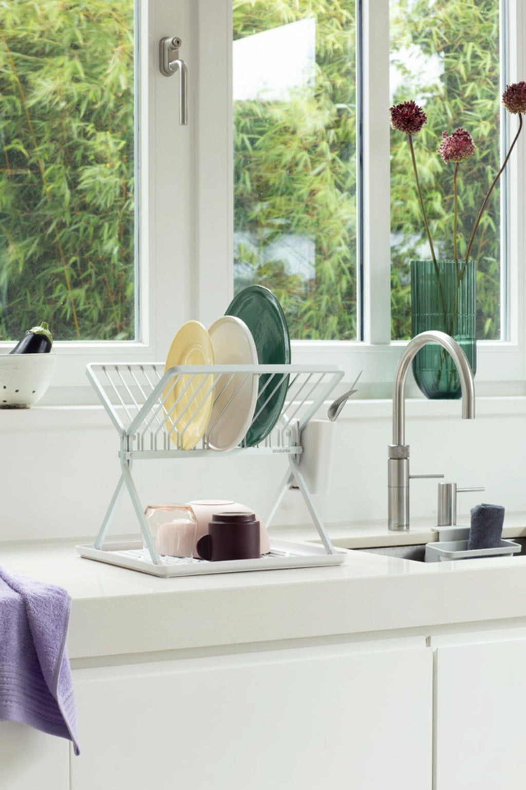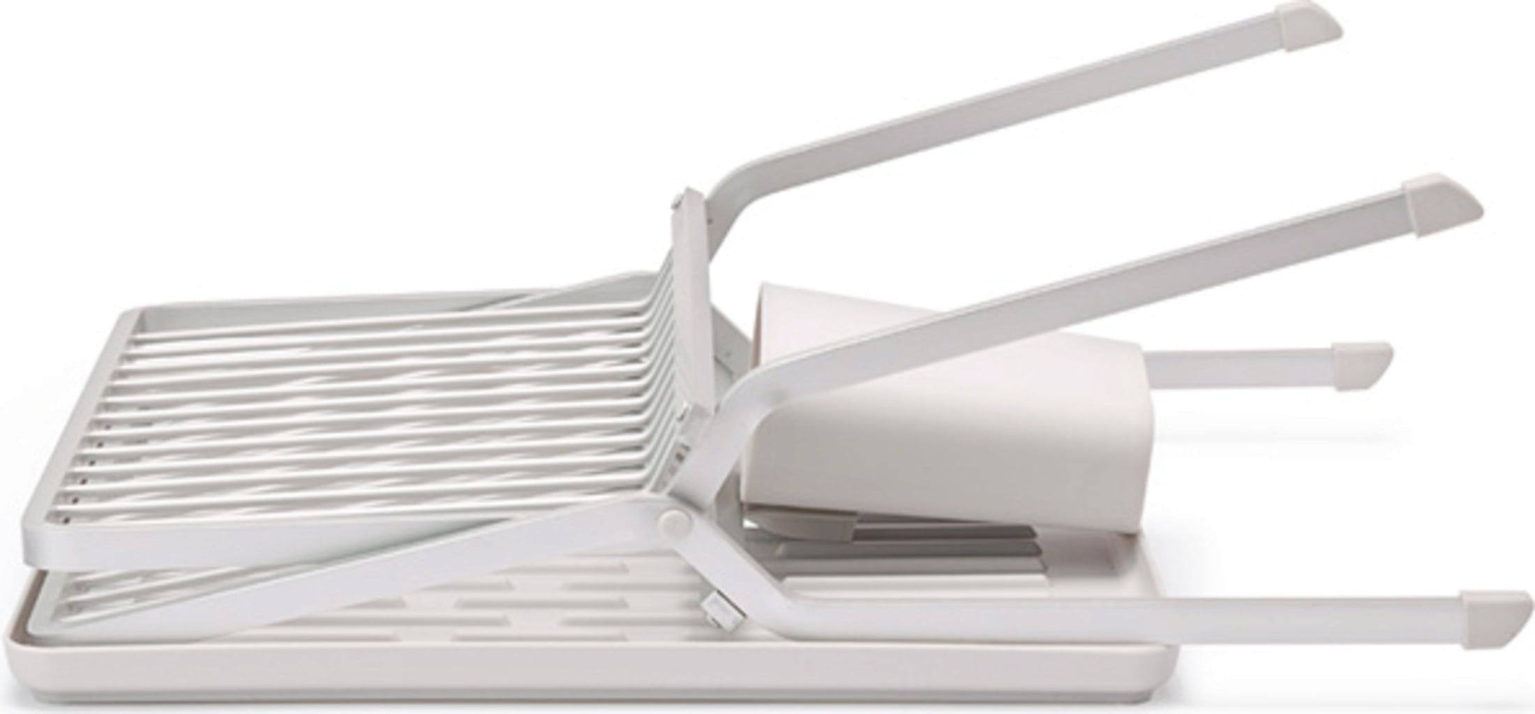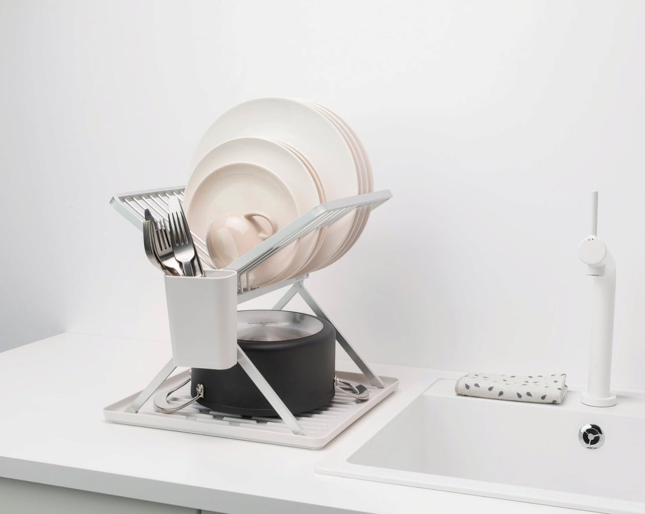 Detta hopfällbara avrinningsställ i aluminium imponerar inte bara med sin utrymmessnåla design och sitt snygga utseende, utan framför allt med sina praktiska funktioner. Den kan fällas ihop snabbt och enkelt, förvaras kompakt och erbjuder plats för upp till 13 tallrikar samt bestick och andra redskap, som kan förvaras i den avtagbara bestickkorgen. Även kastruller och stekpannor känner sig hemma.