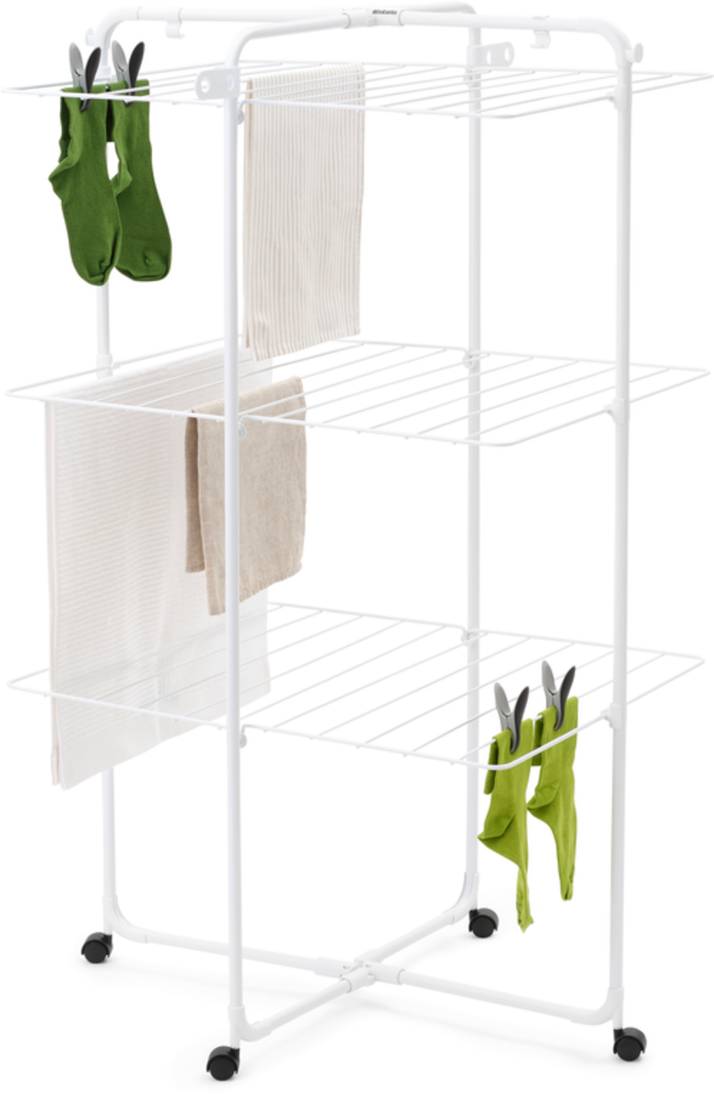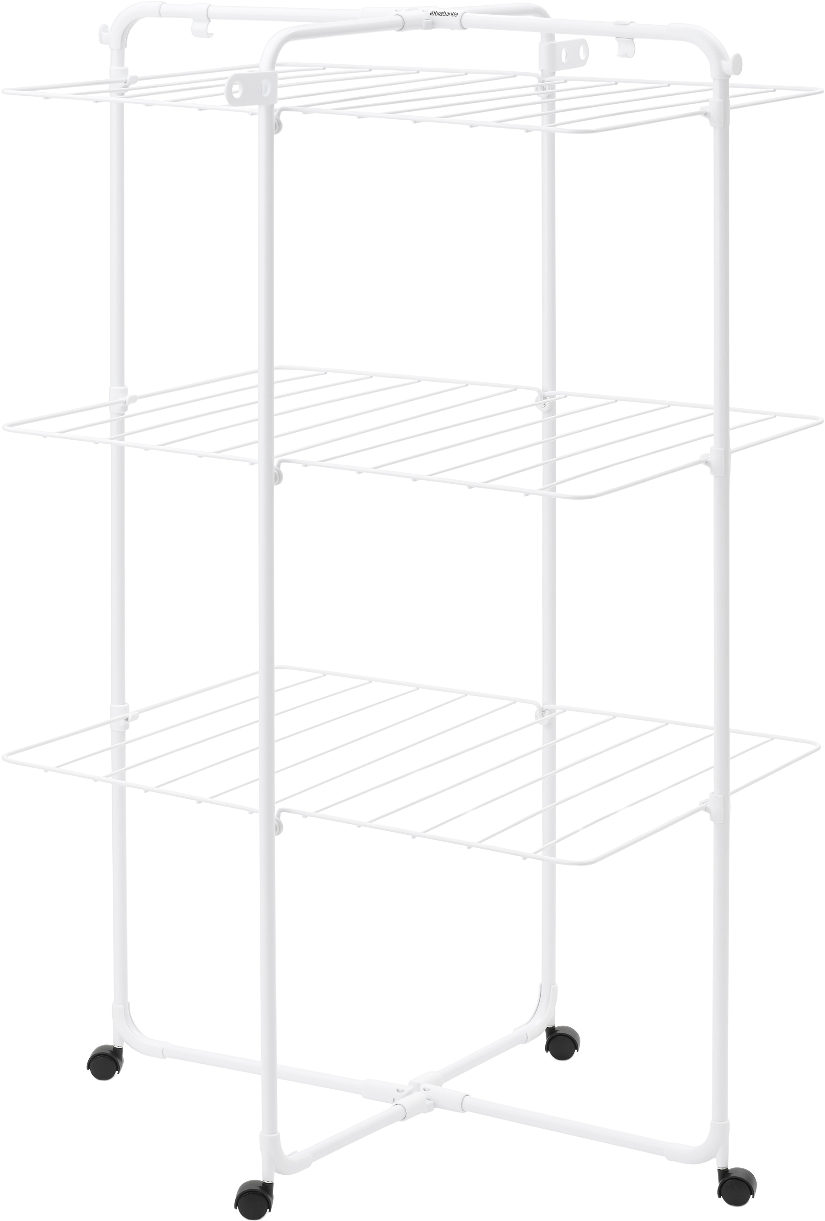 HangOn-torktumlaren med en torklängd på 23 meter är den perfekta vardagshjälparen om du vill torka mycket tvätt på ett platsbesparande sätt. De tre flexibelt vikbara och utfällbara hyllorna ger dig tillräckligt med utrymme för små och stora tvättar - från skjortor till handdukar. Tack vare de fyra hjulen kan klädhängaren enkelt vridas och skjutas in i vilket hörn som helst.