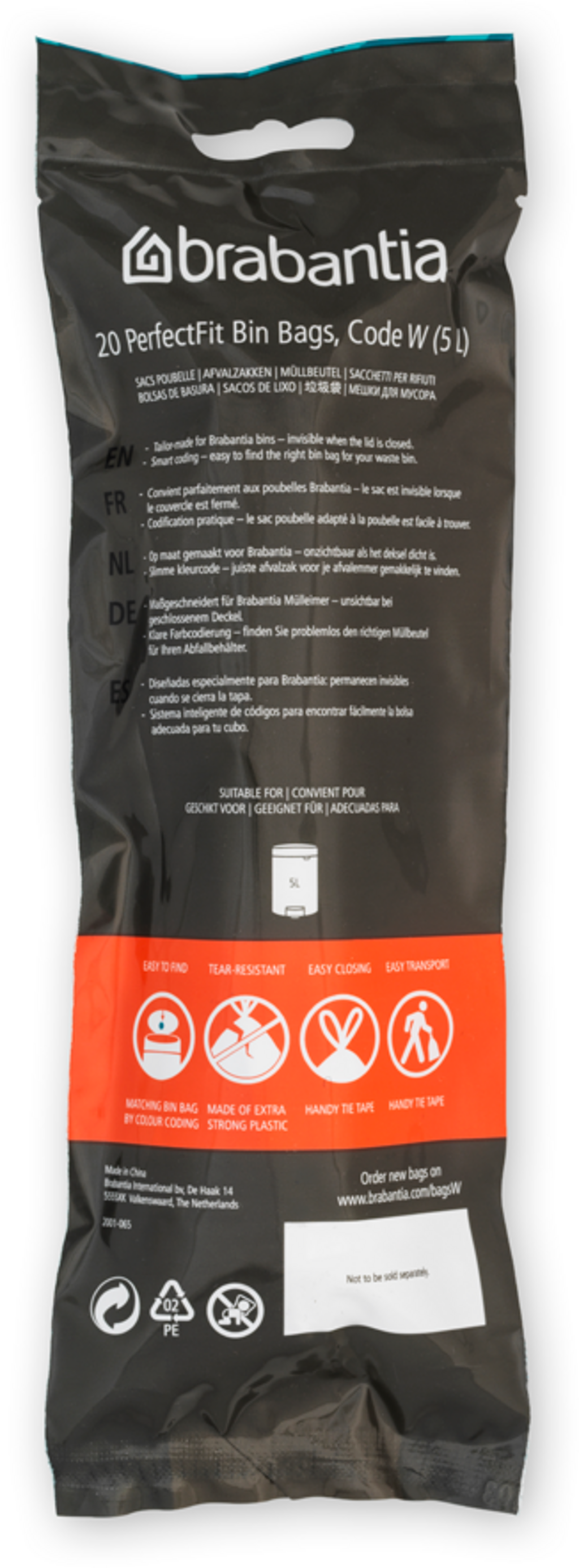 Dessa sopsäckar passar perfekt i Brabantias olika sopkärl och kan sättas in i dem med perfekt passform. Speciella ventilationsöppningar gör det enkelt att sätta in sopsäckarna, medan stängningsbandet gör det enkelt att dra ut och stänga sopsäckarna.