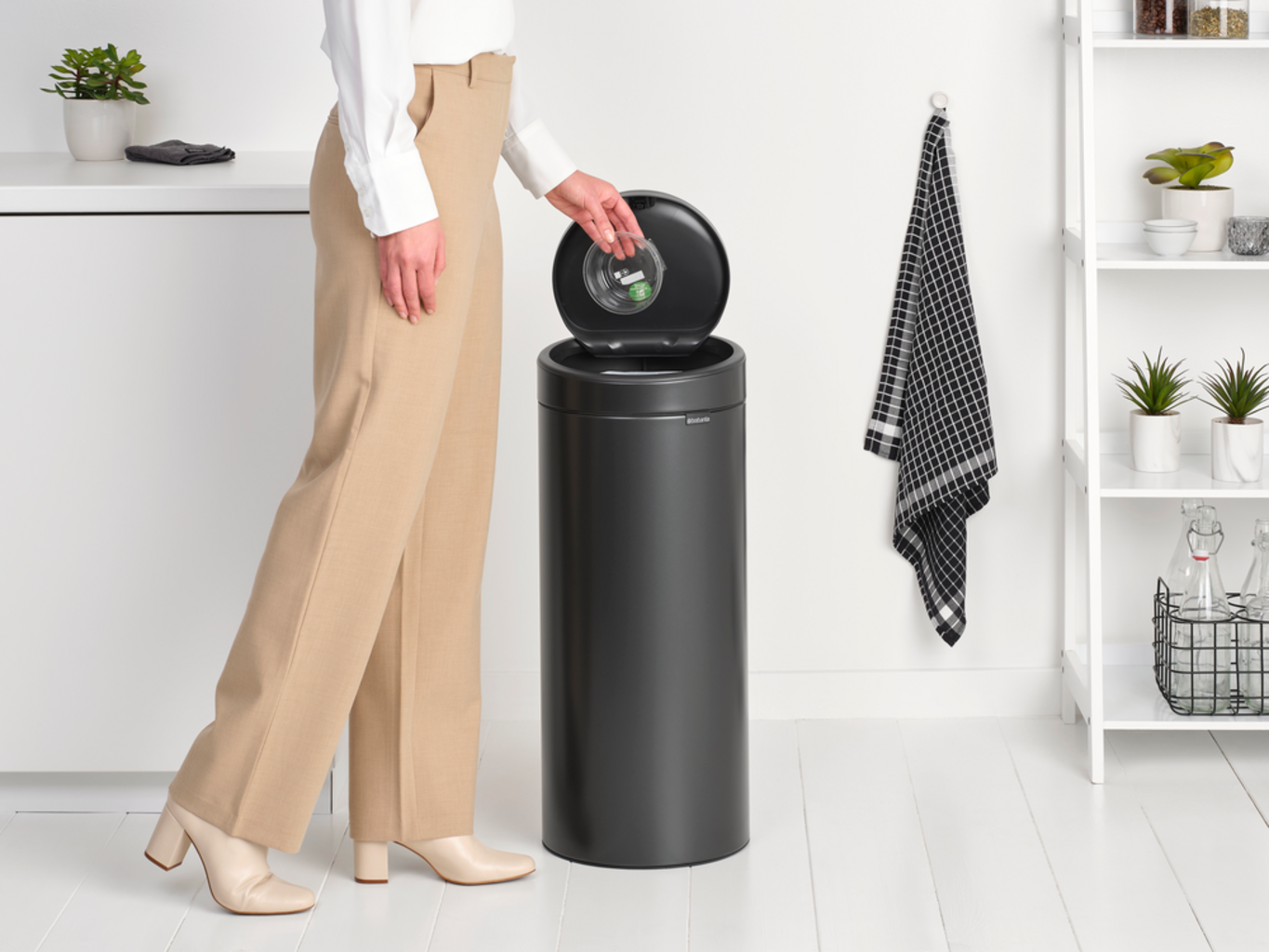 Denna extraordinära avfallskorg imponerar med sin eleganta design och sin innovativa öppningsmekanism. Avfallsbehållarens lock öppnas tyst och försiktigt även vid minsta beröring. Detta är inte bara särskilt hygieniskt, utan gör det också enkelt att byta papperskorgen och rengöra sopkärlet.