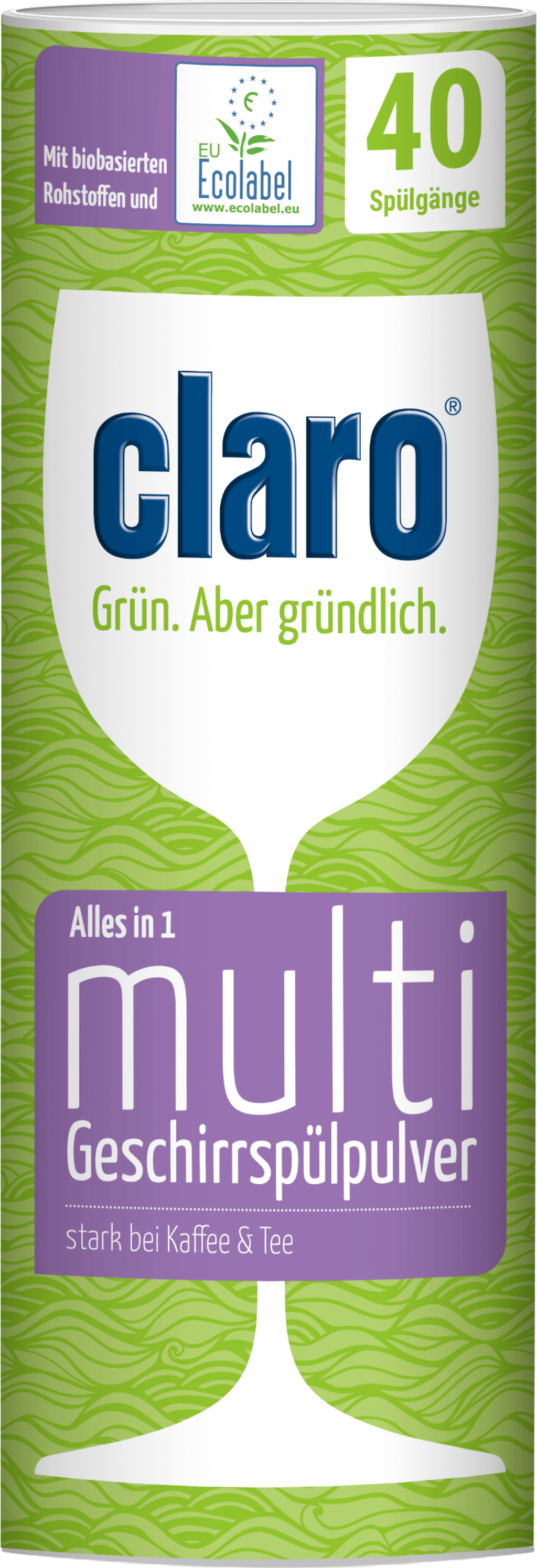 ÖKO Multi-pulvret från claro är ett riktigt allroundpaket för ren disk! Det avlägsnar fläckar och intorkade matrester på ett tillförlitligt sätt och innehåller även en salt- och sköljmedelsfunktion, så att inga ytterligare produkter behövs. Pulvret är veganskt och fritt från klor och palmolja.