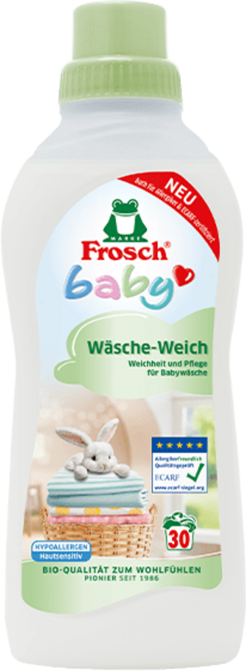 The Baby Tvättmjuk från Frosch garanterar underbart mysig tvätt! Den imponerar med sin allergivänliga formulering, som inte innehåller några ingredienser av animaliskt ursprung eller färgämnen.