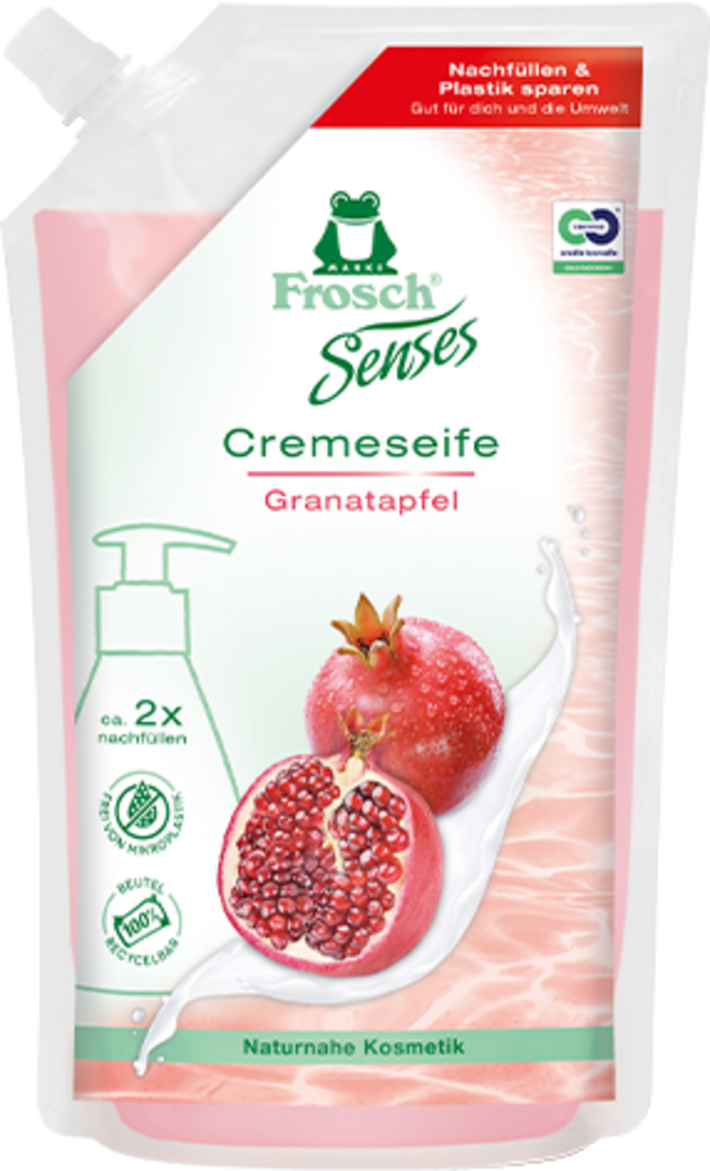 Med denna vårdtvålpåfyllningspåse från Frosch kan du inte bara fylla på din handtvål utan även spara på förpackningsavfall!