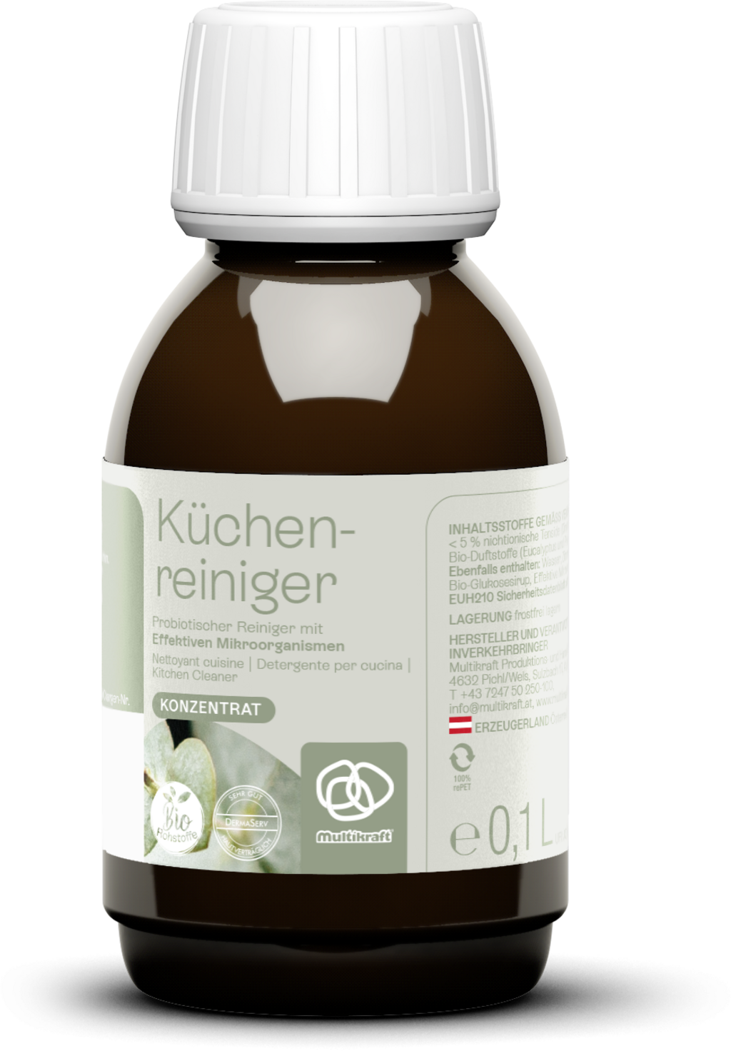 Grapefruktkärneextraktet i eMC Kitchen Cleaner har fettspridande egenskaper och fungerar därför kraftfullt mot envisa fettfläckar. De effektiva mikroorganismer som också ingår i rengöringsmedlet lägger sig på ytorna och bryter ner organisk smuts. De stannar kvar på ytorna och blir aktiva igen när ny smuts uppstår. Rengöringsmedlet är mycket sparsamt, späds ut i vatten och kan sedan användas på köksmöbler och sideboards samt i köksfläktar, kylskåp, bakrör och många andra områden.