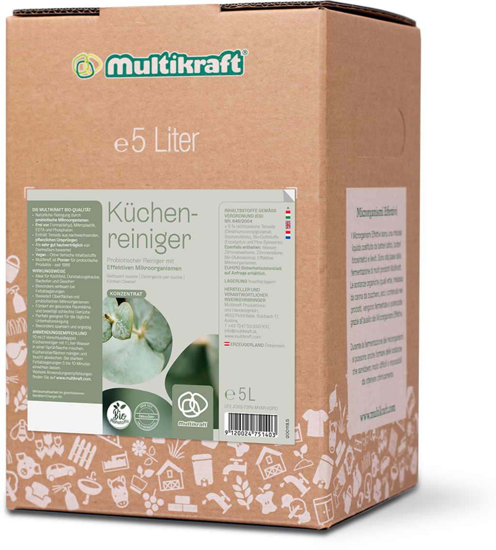 Grapefruktkärneextraktet i eMC Kitchen Cleaner har fettspridande egenskaper och fungerar därför kraftfullt mot envisa fettfläckar. De effektiva mikroorganismer som också ingår i rengöringsmedlet lägger sig på ytorna och bryter ner organisk smuts. De stannar kvar på ytorna och blir aktiva igen när ny smuts uppstår. Rengöringsmedlet är mycket sparsamt, späds ut i vatten och kan sedan användas på köksmöbler och sideboards samt i köksfläktar, kylskåp, bakrör och många andra områden.