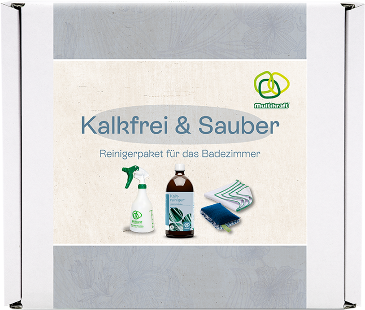 Badsetet ”Kalkfritt & Rent” ger hygienisk renhet utan starka kemikalier. Den probiotiska Multikraft Kalkborttagaren tar effektivt bort kalk och tvålrester, medan sprayflaska och tillbehör ger ett skinande resultat utan ränder.