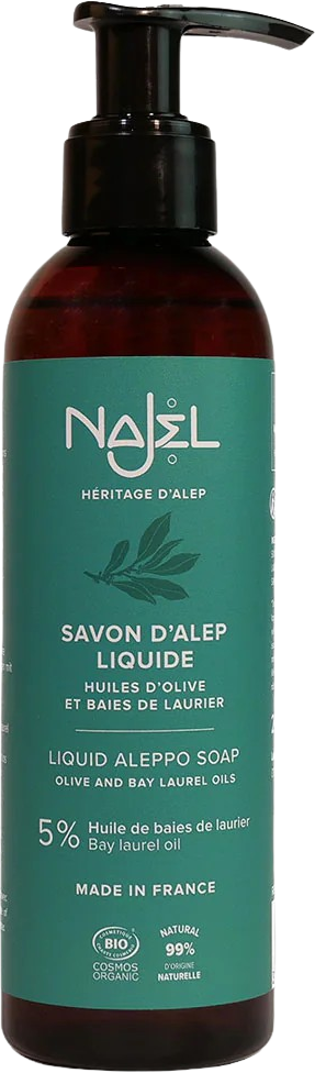 Upptäck den äkta Aleppotvålen i flytande form, som också är lämplig för torr, känslig och irriterad hud. Det är en autentisk produkt som är känd över hela världen. Najel tillverkar den uteslutande med ekologisk olivolja och ekologisk lagerolja för att leverera en naturlig produkt av enastående kvalitet. Upptäck de syriska tvålmästarnas hantverksskicklighet!