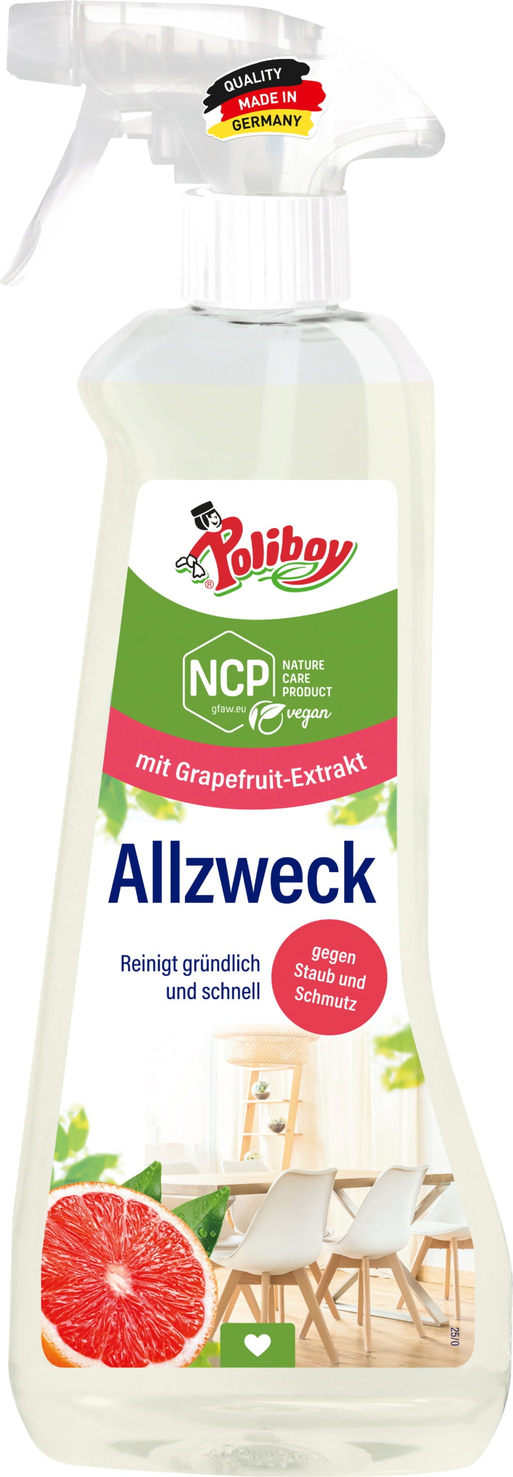 Rengöringen övertygar med sin naturliga, biologiskt nedbrytbara sammansättning och sitt optimala pH-värde - tack vare detta är den skonsam mot träytor och kan även användas på obehandlat trä. Den underbart fruktiga doften av grapefrukt är också av naturligt ursprung - den erhålls från eteriska oljor och säkerställer en känsla av renhet och fräschör - för en övertygande allround rengöringsupplevelse.