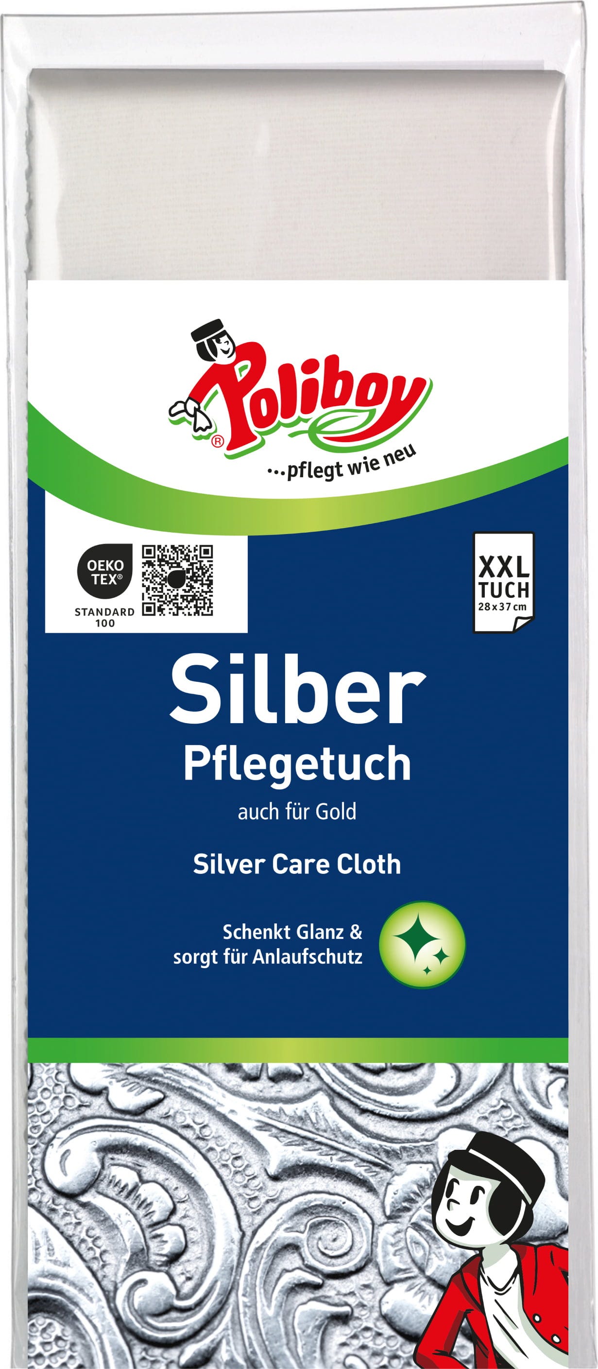 Silverputsduken från Poliboy rengör, vårdar och skyddar föremål av äkta silver eller guld och ger vid regelbunden användning ett långvarigt skydd mot missfärgning. Den kan användas för smycken, kannor, bestick, serviser, medaljer, mynt och alla försilvrade accessoarer som du vill få att glänsa igen.