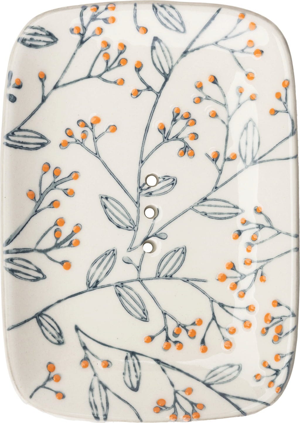 Denna tvålkopp gjord av högkvalitativt stengods stämplades för hand med ett delikat tryck och har hål för vattendränering. Detta gör att tvålen torkar bra efter varje användning.