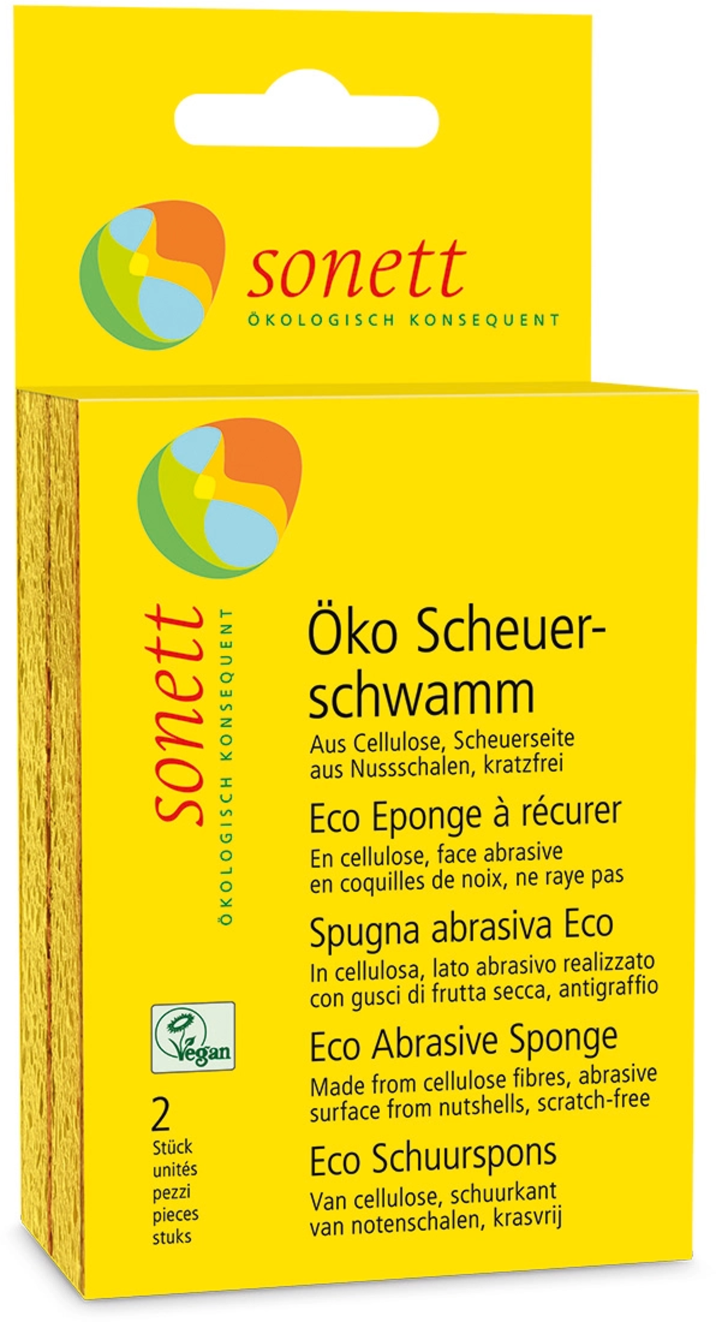 Den reptåliga skursvampen från Sonett är tillverkad av högsta möjliga andel biologiskt nedbrytbara råvaror och består av 100% cellulosafibrer. Skursidan är täckt med 100 % malda mandel- och hasselnötsskal och avlägsnar smuts från rostfritt stål, keramik, glas och porslin. Du kan tvätta svampen i 60°C och återanvända den många gånger.