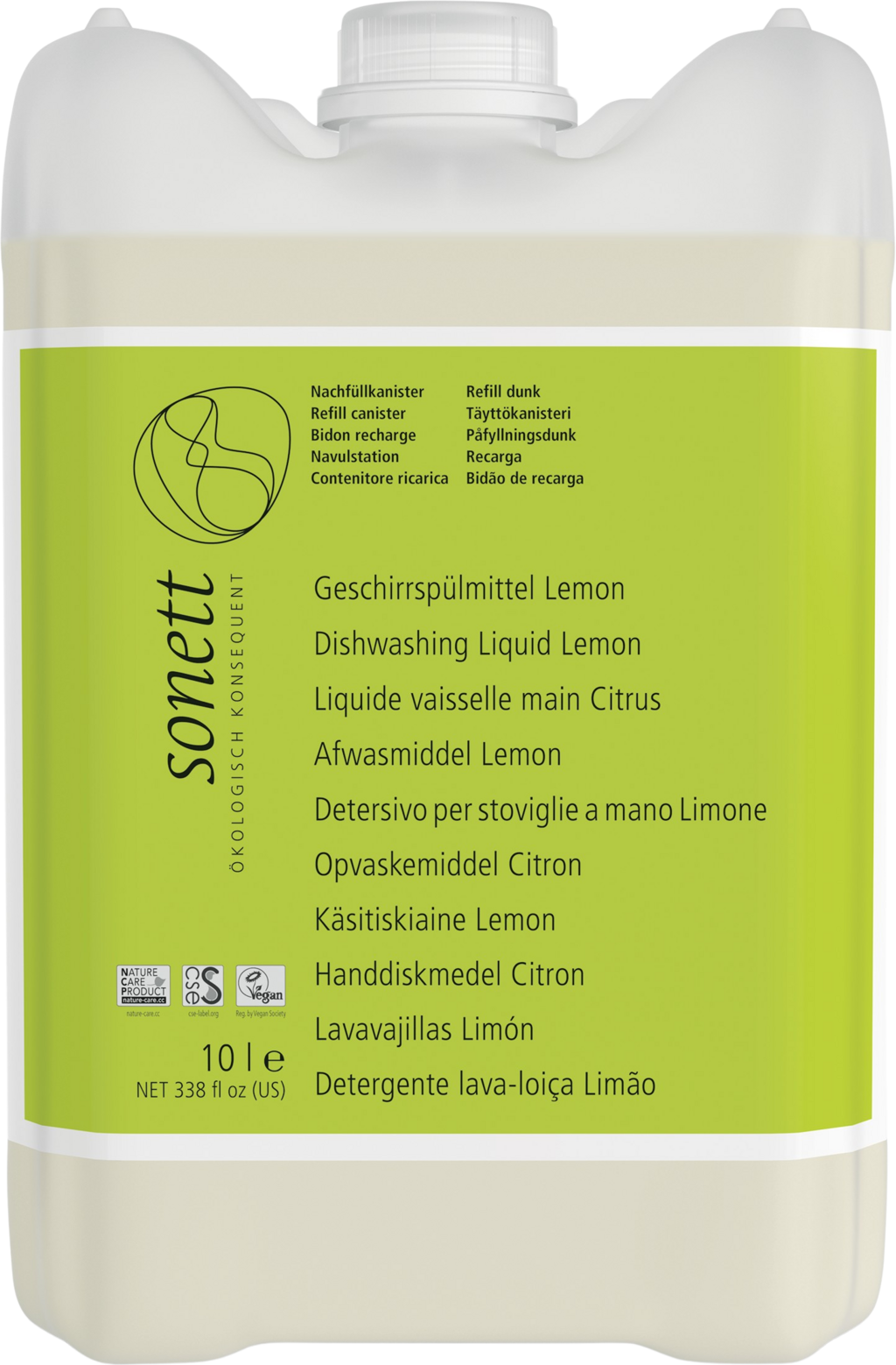 Sonetts koncentrerade diskmedel är extremt ekonomiskt och har en behaglig, fräsch doft av ekologisk citrongräsolja. De använda tensiderna, kokosfettalkoholsulfat och sockertensider, är helt biologiskt nedbrytbara.
