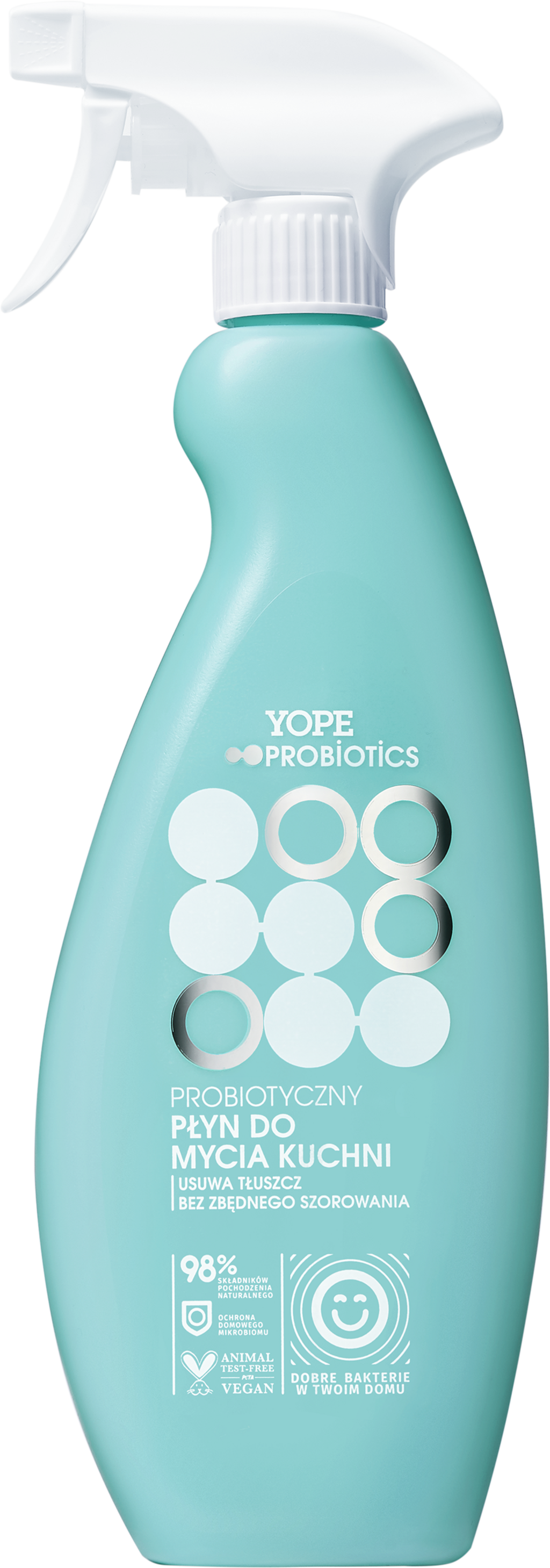 Med den probiotiska köksrengöringen från YOPE får spis och arbetsytor naturlig kraftfull rengöring. Den är särskilt framtagen för köket och bekämpar effektivt fettbeläggningar och vardaglig smuts med hjälp av probiotiska bakterier. Dessa tränger djupt in i små fördjupningar och sprickor i skåp och ytor för att lösa upp smuts där den gärna samlas.